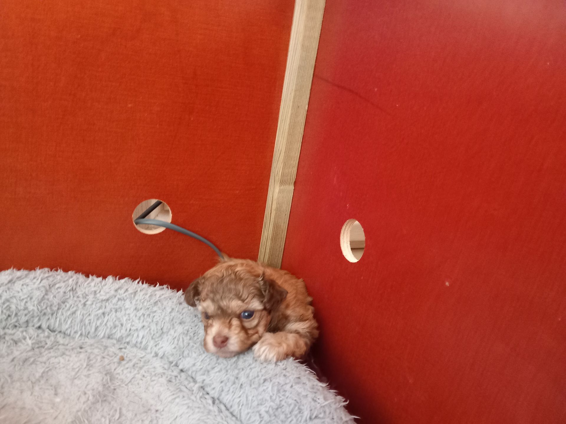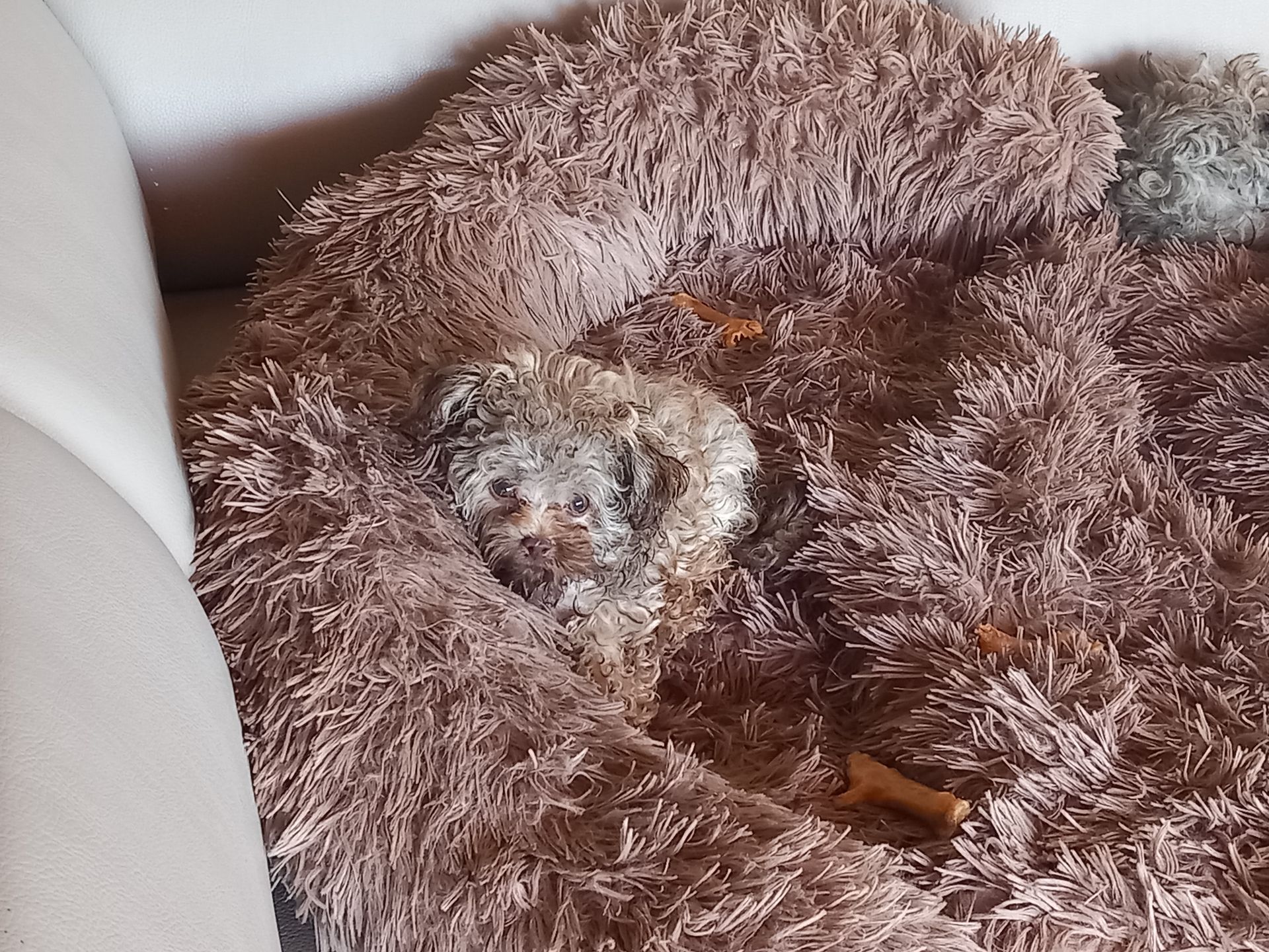 Priscilla ist ein fröhliches Mädchen. Sie spielt gerne mit unseren anderen Hunden. Sie ist unsere kleine farbliche Zobel-Mogelpackung 😜. Das apricot ist mittlerweile hauptsächlich hellblond, nur noch im Gesicht, an den Ohren und Spitzen ist sie apricot.